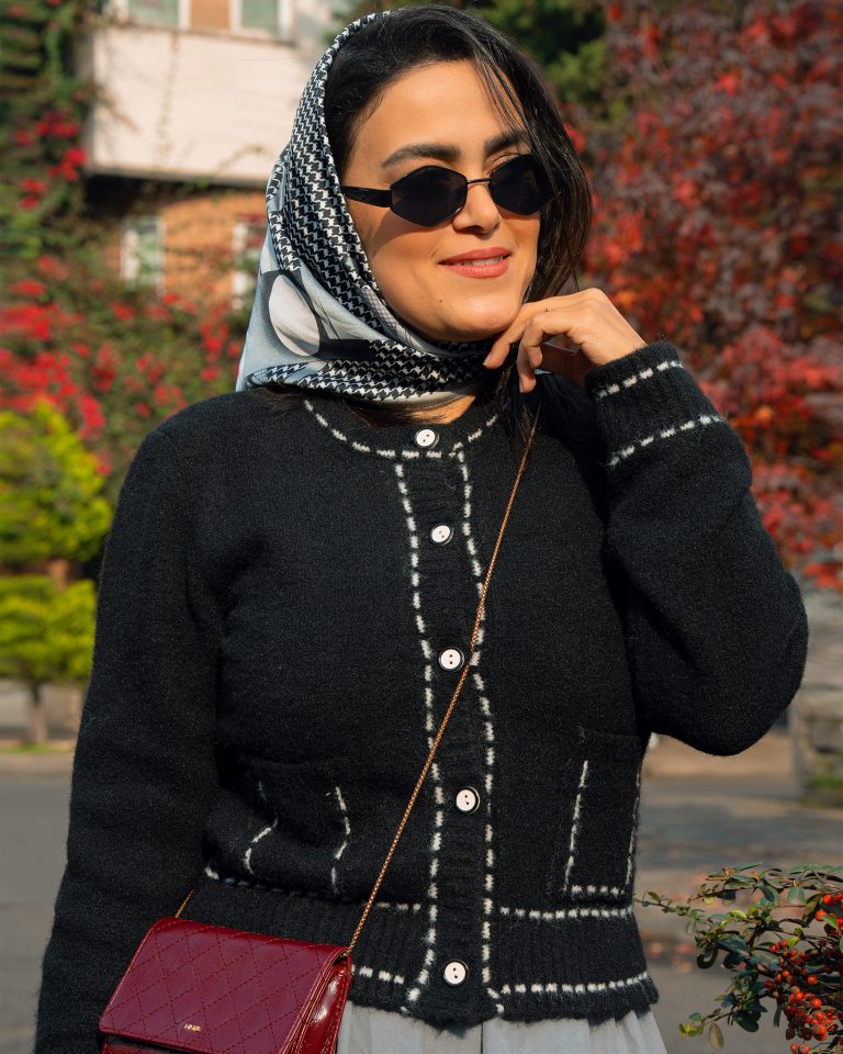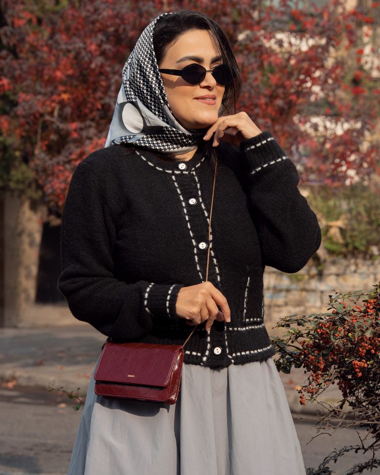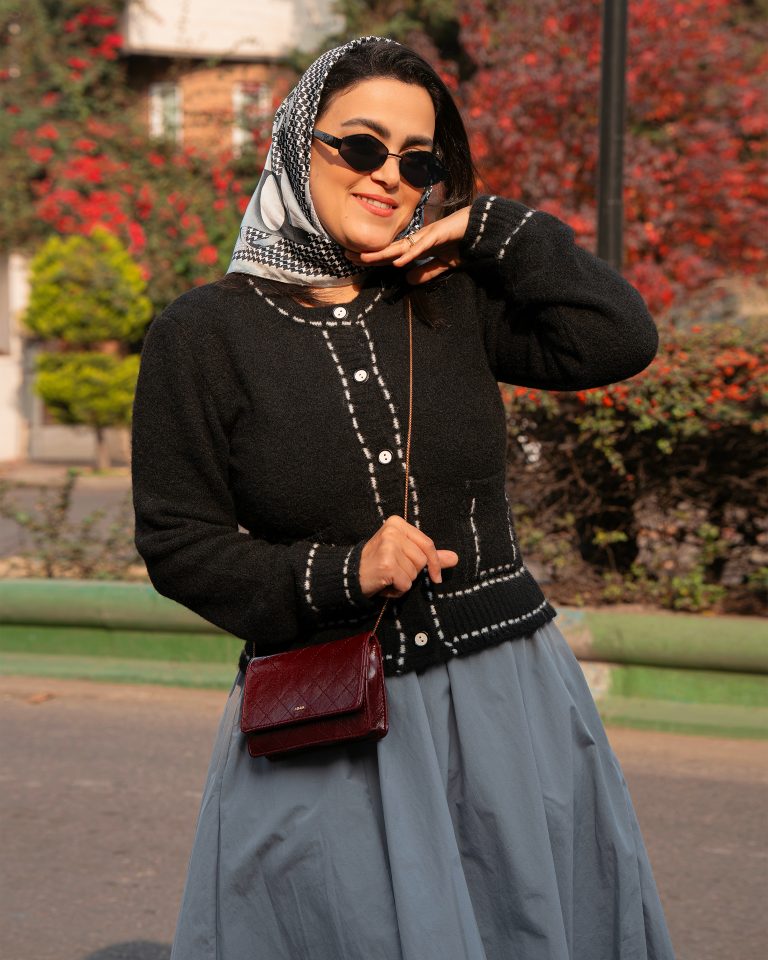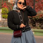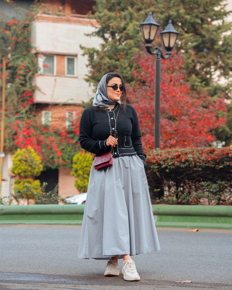 • استایل پاییزی رنگی: ترکیب با شال یا روسریهای رنگ گرم (قرمز، آجری، خردلی).