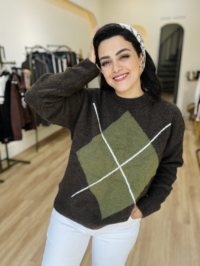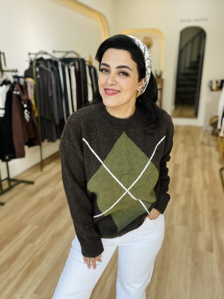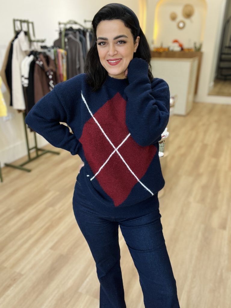 •با شلوار سرمهای و کتانی سفید که در تصویر دیده میشود، هماهنگ و متعادل شده است