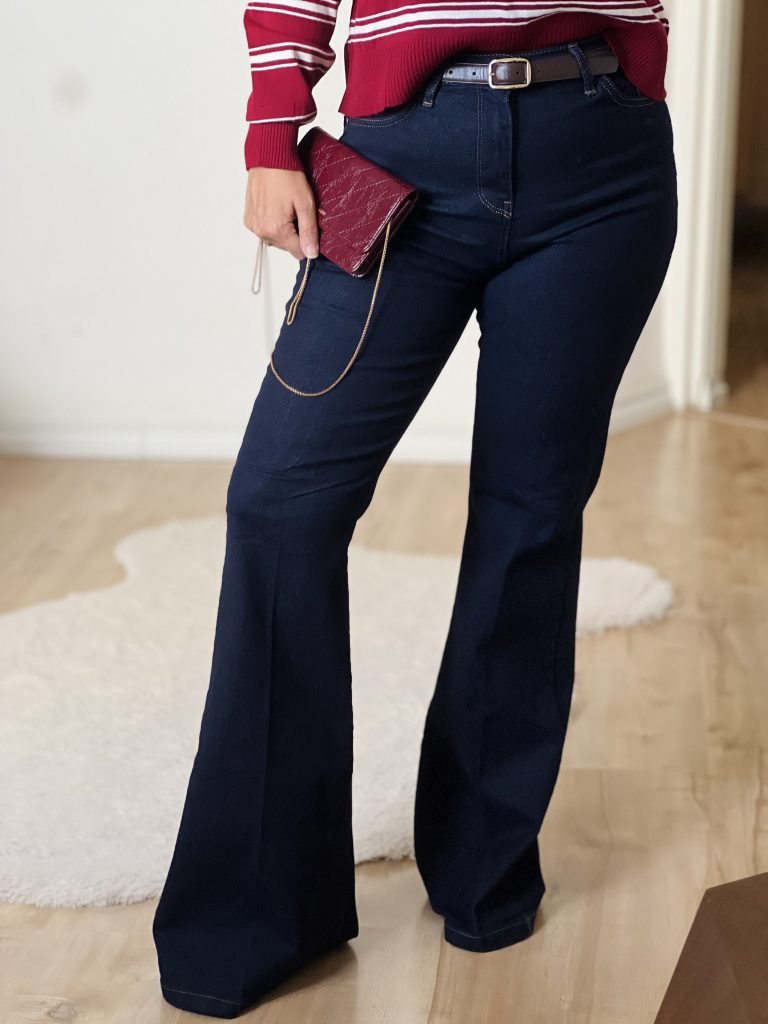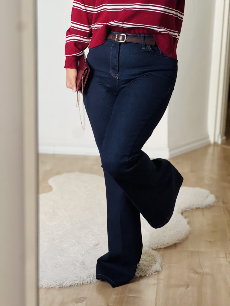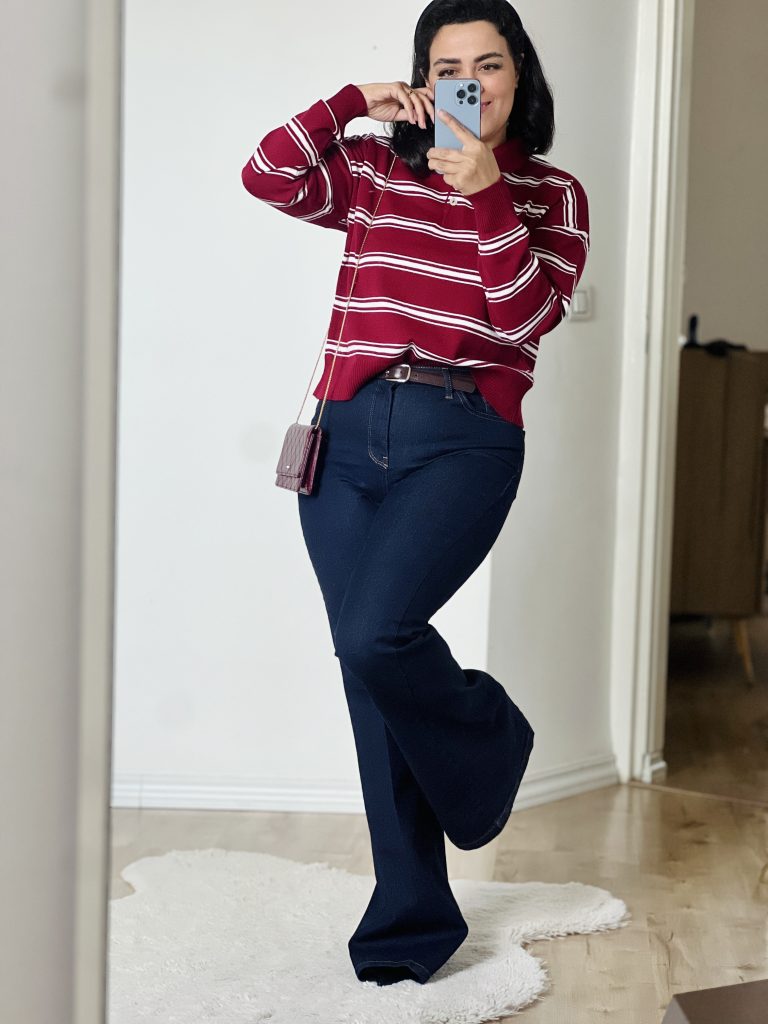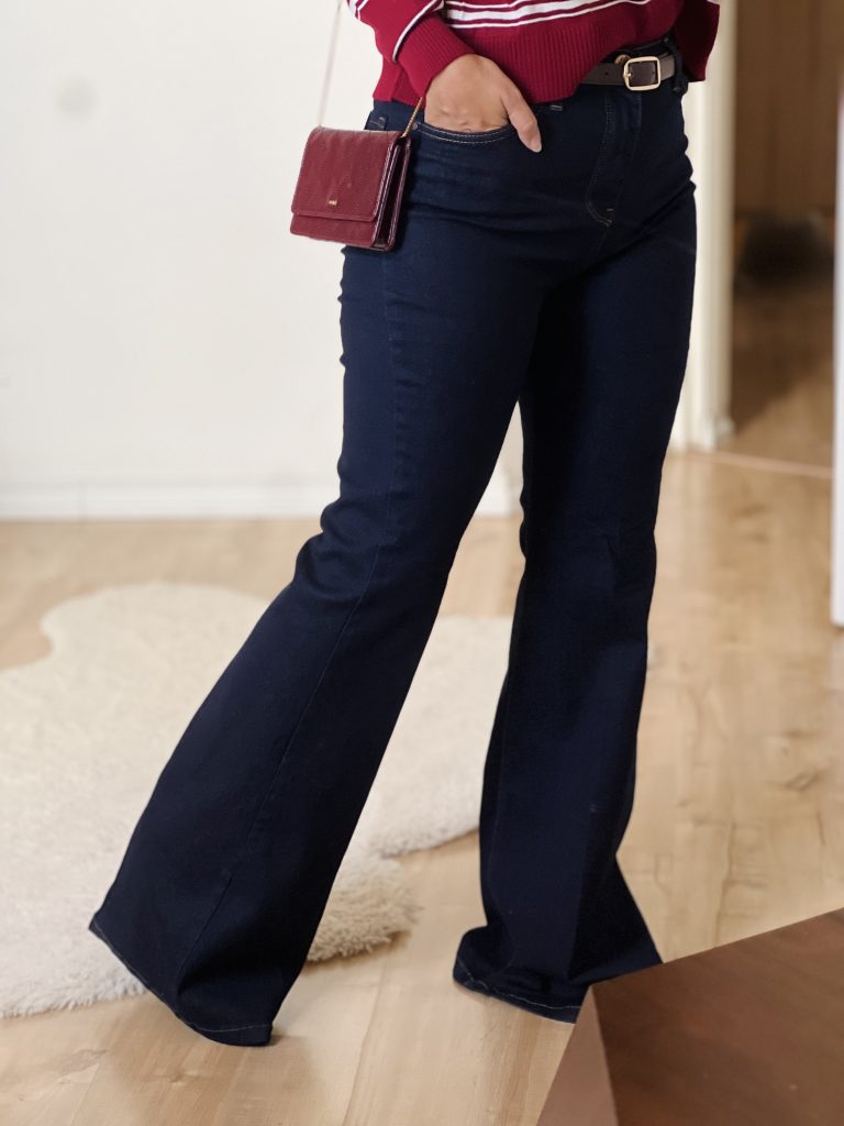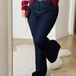 •برش فیت و شیک: شلوار به صورت fit از قسمت کمر تا زانو است و سپس کمی باز میشود و به شکل فلر (flare) به پایین میرود که این به شلوار یک حالت کژوال و راحت میدهد.